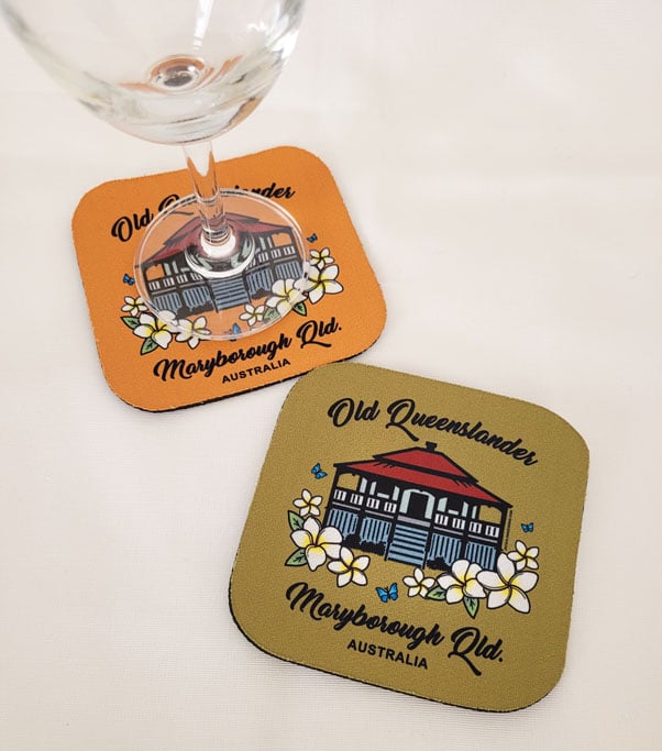 Neoprene Coasters featuring one of Maryborough's iconic Queenslander style homes, and an original design by Jackalina Designs.